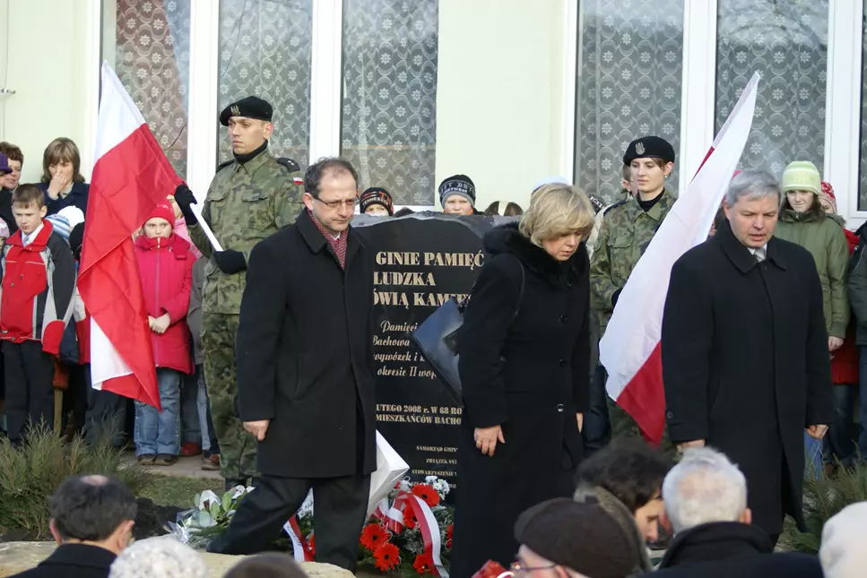 Historii nie zmieni nikt, to co wydarzyło się 68 lat temu było okrutne i boli do dziś. Pamiątkowy obelisk jest oddaniem hołdu wszystkim ofiarom Bachowian z czasu II Wojny Światowej. Jedynie tym może być, nie może być nagrodą, bo tej krzywdy zadanej nikt i nic nie jest w stanie wynagrodzić. Kamień jest wołaniem, pytaniem „dlaczego”, „dlaczego tak musiało być”. Jest także przestrogą mówiącą, że taki czas nigdy nie może powrócić. W zimnym czarnym kamieniu już na zawsze został zawarty ból, krew, płacz i upokorzenie tych którzy cierpieli na nieludzkiej ziemi. Niech kamień krzyczy „nigdy więcej!!!”. Niech kamień mówi: my synowie i córki tej ziemi pamiętamy i nie zapomnimy. Nie zapomną dzieci w szkole bo kamień będzie im zawsze przypominał bolesną historię ich przodków.