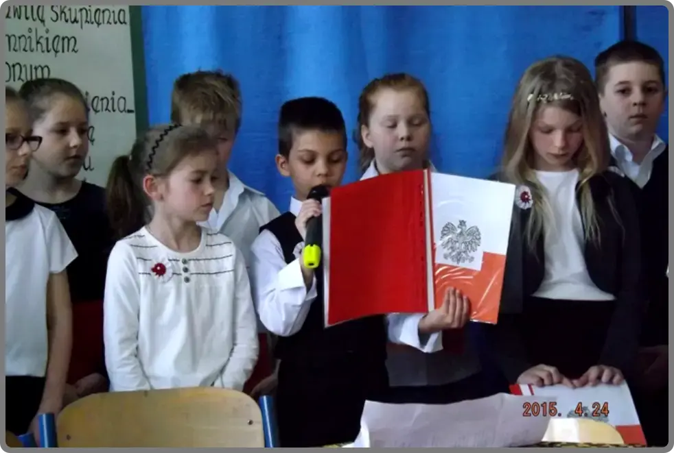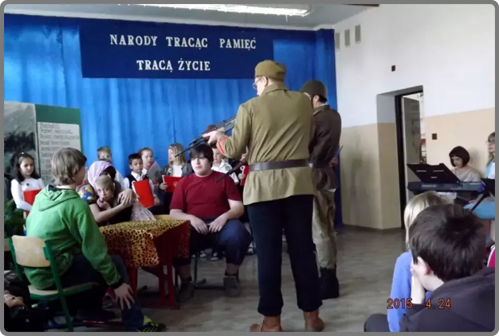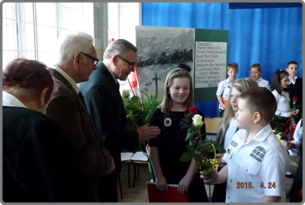 Na zakończenie spotkania  Sybiracy wręczyli Pani Beacie Cichockiej – Dyrektor szkoły – dyplom z podziękowaniem za upamiętnianie wartości patriotycznych oraz książkę pt. „Polacy w Kazachstanie. Zesłania, dziedzictwo, nadzieje, powroty” i życzyli uczniom, by ich dzieciństwo nigdy nie było zakłócone  wojną.