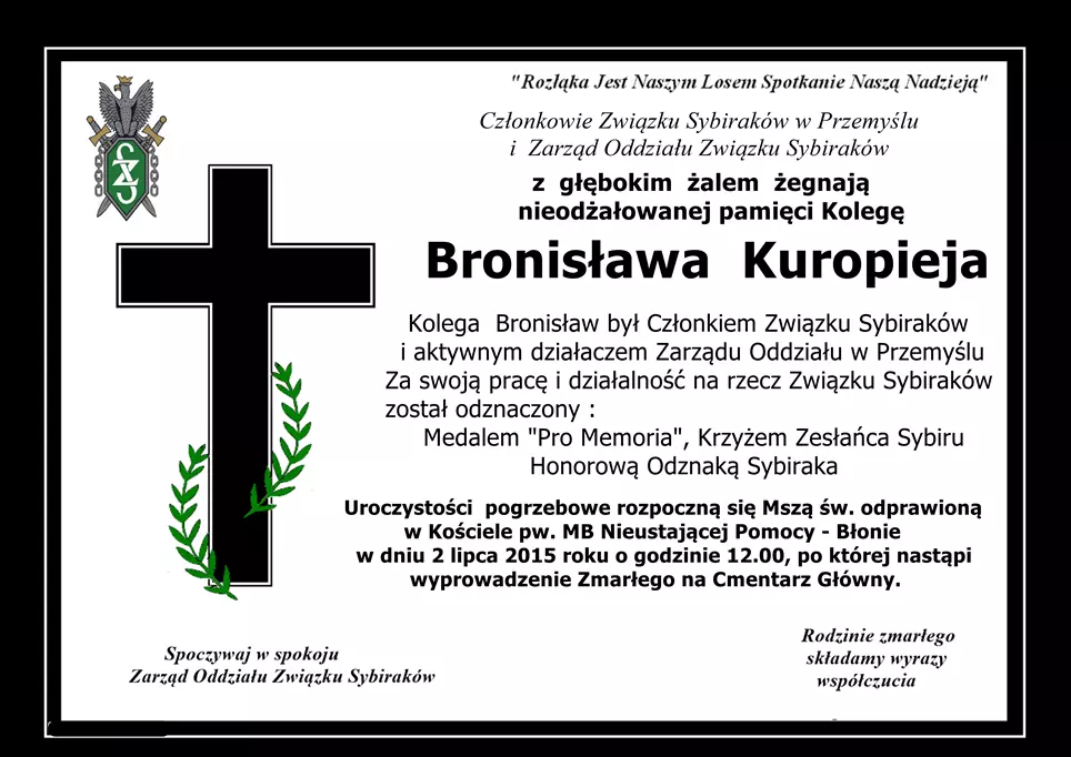 Odszedł od nas śp. Bronisław Kuropiej Członkowie i Zarząd Związku Sybiraków w Przemyślu z głębokim żalem żegnają kolegę Sybiraka śp. Bronisława Kuropieja Post Views: 298 30 czerwca 20152 ODESZLI OD NAS Nawigacja wpisu Poprzedni Poprzedni wpis: 224. Rocznica uchwalenia Konstytucji 3 majaNastępny Następny wpis: Odeszła od nas śp. Zofia Skulska Podobne wpisy Odszedł od nas śp. Józef Lelek 23 września 2025 Wyrazy współczucia dla Kolegi Józefa Sieńko 27 sierpnia 2025 Odeszła od nas śp. Janina Boczar 24 czerwca 2025 Odszedł od nas śp. Eugeniusz Buszta 10 maja 2025 Odeszła od nas śp. Krystyna Sroczyk 27 marca 2025 Odeszła od nas śp. Janina Radyk 17 marca 2025