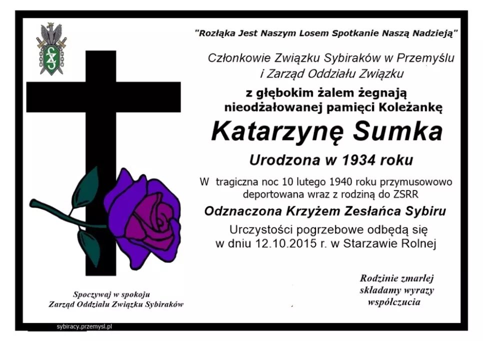Odeszła od nas śp. Katarzyna Sumka Członkowie i Zarząd Związku Sybiraków Oddział w Przemyślu z głębokim żalem żegnają koleżankę śp. Katarzynę Sumka Post Views: 339 11 października 20152 ODESZLI OD NAS Nawigacja wpisu Poprzedni Poprzedni wpis: Dzień Sybiraka w Przemyślu – 17.09.2015 r. (Film)Następny Następny wpis: Odeszła od nas śp. Zofia Rutkowska Podobne wpisy Odszedł od nas śp. Józef Lelek 23 września 2025 Wyrazy współczucia dla Kolegi Józefa Sieńko 27 sierpnia 2025 Odeszła od nas śp. Janina Boczar 24 czerwca 2025 Odszedł od nas śp. Eugeniusz Buszta 10 maja 2025 Odeszła od nas śp. Krystyna Sroczyk 27 marca 2025 Odeszła od nas śp. Janina Radyk 17 marca 2025