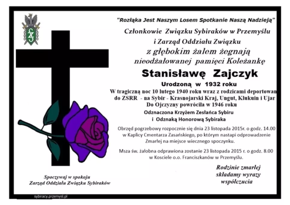 Odeszła od nas śp. Stanisława Zajczyk Członkowie i Zarząd Związku Sybiraków Oddział w Przemyślu z głębokim żalem żegnają koleżankę śp. Stanisławę Zajczyk Post Views: 297 21 listopada 20152 ODESZLI OD NAS Nawigacja wpisu Poprzedni Poprzedni wpis: Rocznica odzyskania Niepodległości w Przemyślu – 11.11.2015 rokNastępny Następny wpis: Odszedł od nas śp. Stanisław Jasz Podobne wpisy Odszedł od nas śp. Józef Lelek 23 września 2025 Wyrazy współczucia dla Kolegi Józefa Sieńko 27 sierpnia 2025 Odeszła od nas śp. Janina Boczar 24 czerwca 2025 Odszedł od nas śp. Eugeniusz Buszta 10 maja 2025 Odeszła od nas śp. Krystyna Sroczyk 27 marca 2025 Odeszła od nas śp. Janina Radyk 17 marca 2025