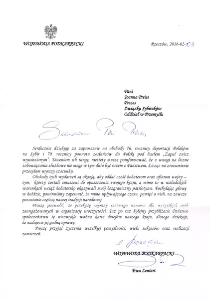 List Wojewody Podkarpackiej Ewy Leniart Post Views: 319 7 lutego 20162 PISMA Nawigacja wpisu Poprzedni Poprzedni wpis: Spotkanie opłatkowe Członków Związku Sybiraków Oddział w Przemyślu – 10.01.2016 rokNastępny Następny wpis: 76. rocznica deportacji Polaków na Sybir – „Zapal Znicz Wywiezionym”. 7.02.2016 r. (Film) Podobne wpisy List Dyrektor Pedagogicznej Biblioteki Wojewódzkiej 3 września 2022 List od Prezydenta Miasta Przemyśla 12 lutego 2022 List od Pani Wojewody 12 lutego 2022 List Szefa Urzędu do spraw Kombatantów i Osób Represjonowanych 27 grudnia 2020 List Marszałka Sejmu RP z okazji Dnia Sybiraka 17.09.2017 r. 17 września 2017 List Posła na Sejm RP Andrzeja Matusiewicza z okazji Dnia Sybiraka 17 września 2017