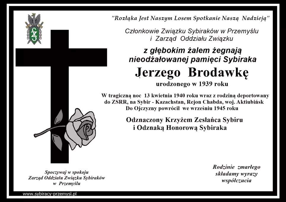 Odszedł od nas śp. Jerzy Brodawka Członkowie i Zarząd Związku Sybiraków w Przemyślu z głębokim żalem żegnają kolegę Sybiraka śp. Jerzego Brodawkę. Post Views: 366 12 lutego 20162 ODESZLI OD NAS Nawigacja wpisu Poprzedni Poprzedni wpis: Odeszła od nas śp. Maria AnkiejczykNastępny Następny wpis: Lekcja historii w Gimnazjum Nr 1 im. Orląt Przemyskich. Podobne wpisy Odszedł od nas śp. Józef Lelek 23 września 2025 Wyrazy współczucia dla Kolegi Józefa Sieńko 27 sierpnia 2025 Odeszła od nas śp. Janina Boczar 24 czerwca 2025 Odszedł od nas śp. Eugeniusz Buszta 10 maja 2025 Odeszła od nas śp. Krystyna Sroczyk 27 marca 2025 Odeszła od nas śp. Janina Radyk 17 marca 2025