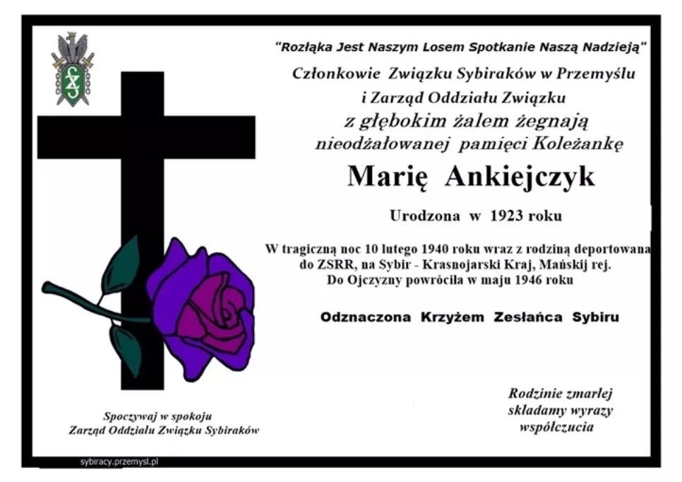 Odeszła od nas śp. Maria Ankiejczyk Członkowie i Zarząd Związku Sybiraków Oddział w Przemyślu z głębokim żalem żegnają koleżankę Marię Ankiejczyk. Post Views: 310 12 lutego 20162 ODESZLI OD NAS Nawigacja wpisu Poprzedni Poprzedni wpis: Koszmar, który się śni po nocach. Przemyśl – BakończyceNastępny Następny wpis: Odszedł od nas śp. Jerzy Brodawka Podobne wpisy Odszedł od nas śp. Józef Lelek 23 września 2025 Wyrazy współczucia dla Kolegi Józefa Sieńko 27 sierpnia 2025 Odeszła od nas śp. Janina Boczar 24 czerwca 2025 Odszedł od nas śp. Eugeniusz Buszta 10 maja 2025 Odeszła od nas śp. Krystyna Sroczyk 27 marca 2025 Odeszła od nas śp. Janina Radyk 17 marca 2025