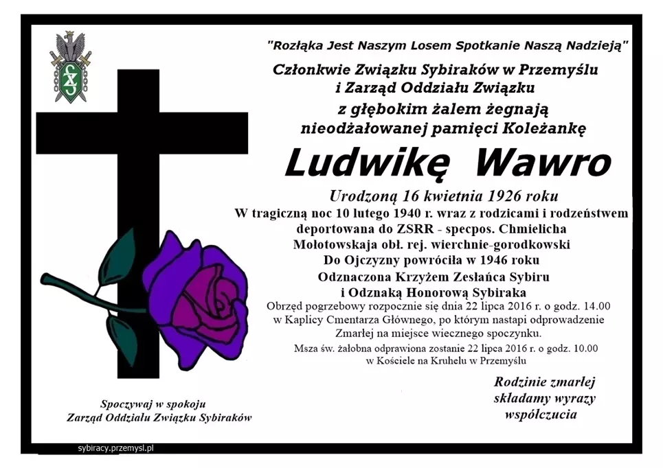 Odeszła od nas śp. Ludwika Wawro Członkowie i Zarząd Związku Sybiraków Oddział w Przemyślu z głębokim żalem żegnają koleżankę śp. Ludwikę Wawro. Post Views: 289 20 lipca 20162 ODESZLI OD NAS Nawigacja wpisu Poprzedni Poprzedni wpis: List Zarządu Głównego Związku Sybiraków po uroczystości odsłonięcia i poświęcenia pomnika.Następny Następny wpis: Odeszła od nas śp. Aniela Król Podobne wpisy Odszedł od nas śp. Józef Lelek 23 września 2025 Wyrazy współczucia dla Kolegi Józefa Sieńko 27 sierpnia 2025 Odeszła od nas śp. Janina Boczar 24 czerwca 2025 Odszedł od nas śp. Eugeniusz Buszta 10 maja 2025 Odeszła od nas śp. Krystyna Sroczyk 27 marca 2025 Odeszła od nas śp. Janina Radyk 17 marca 2025