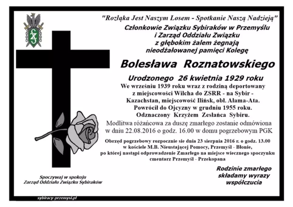 Odszedł od nas Bolesław Roznatowski Członkowie i Zarząd Związku Sybiraków Oddział w Przemyślu z głębokim żalem żegnają kolegę Bolesława Roznatowskiego Post Views: 281 20 sierpnia 20162 ODESZLI OD NAS Nawigacja wpisu Poprzedni Poprzedni wpis: Odeszła od nas śp. Aniela KrólNastępny Następny wpis: Odszedł od nas śp. Mieczysław Rydzik Podobne wpisy Odszedł od nas śp. Józef Lelek 23 września 2025 Wyrazy współczucia dla Kolegi Józefa Sieńko 27 sierpnia 2025 Odeszła od nas śp. Janina Boczar 24 czerwca 2025 Odszedł od nas śp. Eugeniusz Buszta 10 maja 2025 Odeszła od nas śp. Krystyna Sroczyk 27 marca 2025 Odeszła od nas śp. Janina Radyk 17 marca 2025