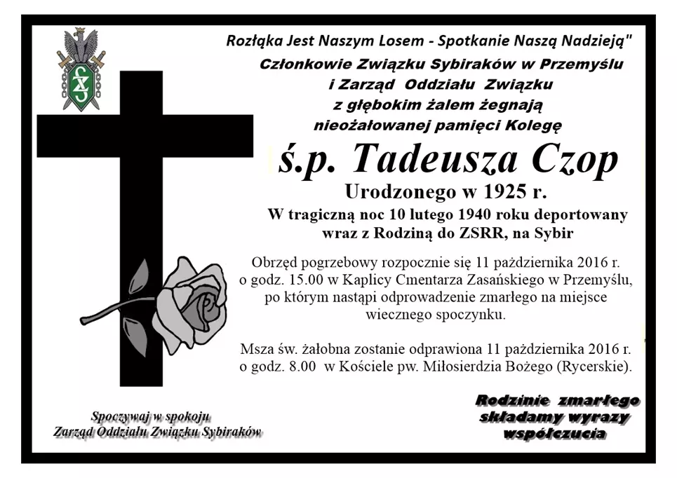 Odszedł od nas śp. Tadeusz Czop Członkowie i Zarząd Związku Sybiraków w Przemyślu z głębokim żalem żegnają kolegę Sybiraka śp. Tadeusza Czop, Post Views: 357 8 października 20162 ODESZLI OD NAS Nawigacja wpisu Poprzedni Poprzedni wpis: Dzień Sybiraka i Pogrzeb kpt Władysława Koby w Przemyślu. (Film)Następny Następny wpis: Odeszła od nas śp. Maria Pietras Podobne wpisy Odszedł od nas śp. Józef Lelek 23 września 2025 Wyrazy współczucia dla Kolegi Józefa Sieńko 27 sierpnia 2025 Odeszła od nas śp. Janina Boczar 24 czerwca 2025 Odszedł od nas śp. Eugeniusz Buszta 10 maja 2025 Odeszła od nas śp. Krystyna Sroczyk 27 marca 2025 Odeszła od nas śp. Janina Radyk 17 marca 2025