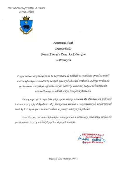 List Przewodniczącej Rady Miejskiej w Przemyślu Post Views: 336 17 lutego 20172 PISMA Nawigacja wpisu Poprzedni Poprzedni wpis: „Poranek Patriotyczny” – losy Sybiraków w walce o Polskę. 15.02.1017 r.Następny Następny wpis: Lekcja historii w Szkole Podstawowej Nr 6 w Przemyślu. Podobne wpisy List Dyrektor Pedagogicznej Biblioteki Wojewódzkiej 3 września 2022 List od Prezydenta Miasta Przemyśla 12 lutego 2022 List od Pani Wojewody 12 lutego 2022 List Szefa Urzędu do spraw Kombatantów i Osób Represjonowanych 27 grudnia 2020 List Marszałka Sejmu RP z okazji Dnia Sybiraka 17.09.2017 r. 17 września 2017 List Posła na Sejm RP Andrzeja Matusiewicza z okazji Dnia Sybiraka 17 września 2017