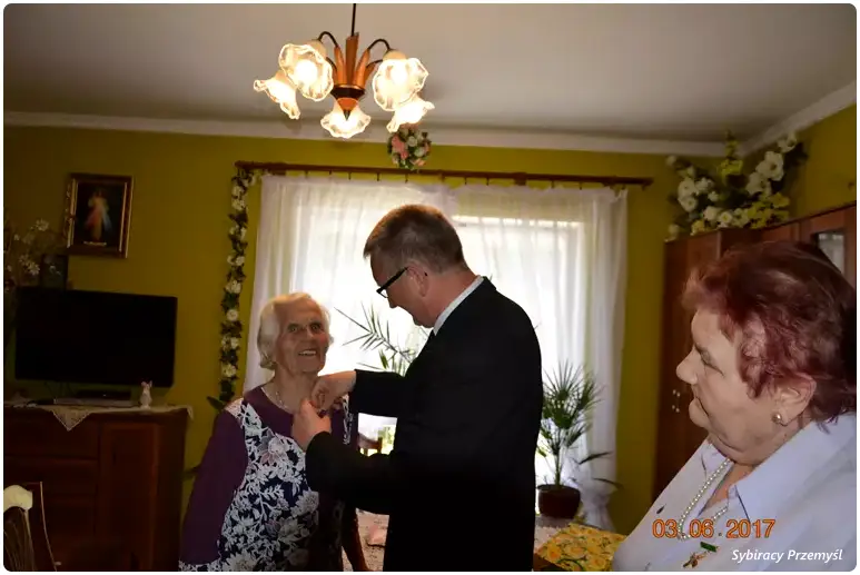 Prezes Zarządu Głównego Związku Sybiraków Kordian Borejko odznaczył Wincentynę Król Srebrną Odznaką Honorową za Zasługi dla Związku Sybiraków.