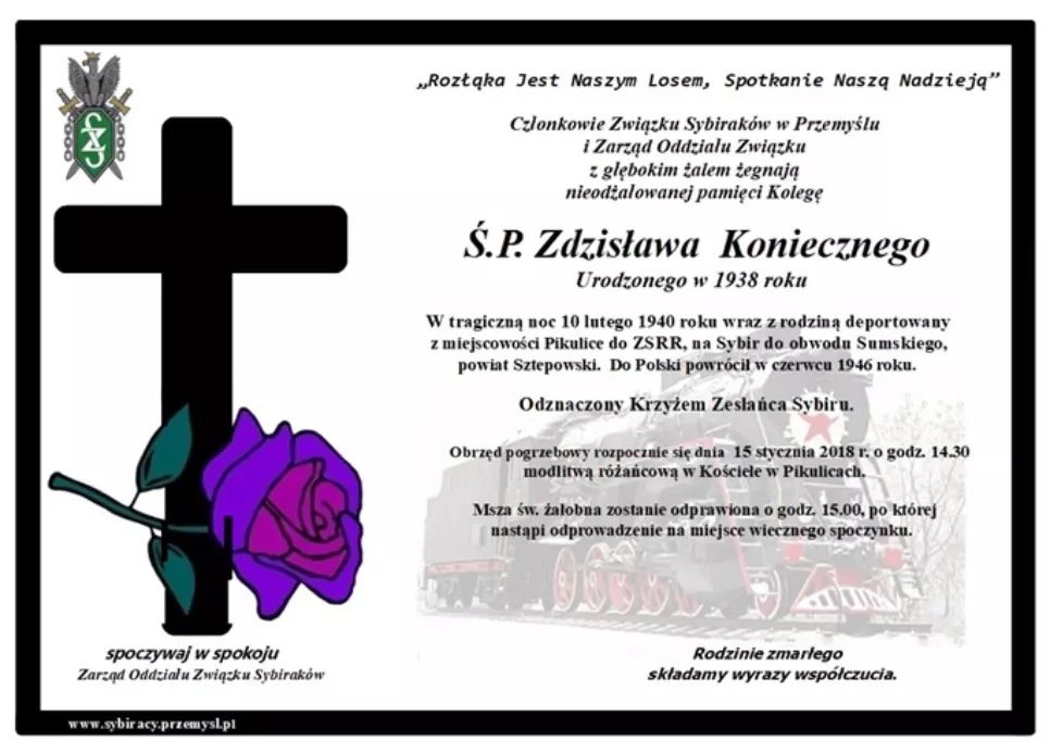 Odszedł od nas śp. Zdzisław Konieczny Członkowie i Zarząd Związku Sybiraków w Przemyślu z głębokim żalem żegnają kolegę Sybiraka śp. Zdzisława Koniecznego Post Views: 361 13 stycznia 20182 ODESZLI OD NAS Nawigacja wpisu Poprzedni Poprzedni wpis: Święto Niepodległości Polski – 11.11.2017 r.Następny Następny wpis: Odeszła od nas śp. Maria Prokopska Podobne wpisy Odszedł od nas śp. Józef Lelek 23 września 2025 Wyrazy współczucia dla Kolegi Józefa Sieńko 27 sierpnia 2025 Odeszła od nas śp. Janina Boczar 24 czerwca 2025 Odszedł od nas śp. Eugeniusz Buszta 10 maja 2025 Odeszła od nas śp. Krystyna Sroczyk 27 marca 2025 Odeszła od nas śp. Janina Radyk 17 marca 2025