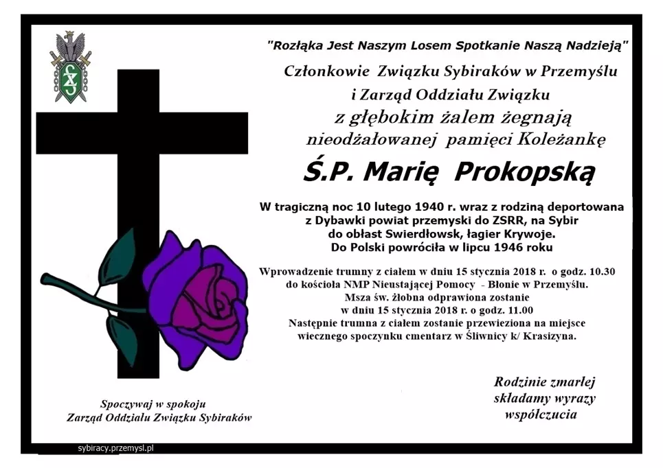 Odeszła od nas śp. Maria Prokopska Członkowie i Zarząd Związku Sybiraków Oddział w Przemyślu z głębokim żalem żegnają koleżankę śp. Marię Prokopską. Post Views: 300 14 stycznia 20182 ODESZLI OD NAS Nawigacja wpisu Poprzedni Poprzedni wpis: Odszedł od nas śp. Zdzisław KoniecznyNastępny Następny wpis: Spotkanie opłatkowe przemyskich Sybiraków – 14.01.2018 rok Podobne wpisy Odszedł od nas śp. Józef Lelek 23 września 2025 Wyrazy współczucia dla Kolegi Józefa Sieńko 27 sierpnia 2025 Odeszła od nas śp. Janina Boczar 24 czerwca 2025 Odszedł od nas śp. Eugeniusz Buszta 10 maja 2025 Odeszła od nas śp. Krystyna Sroczyk 27 marca 2025 Odeszła od nas śp. Janina Radyk 17 marca 2025