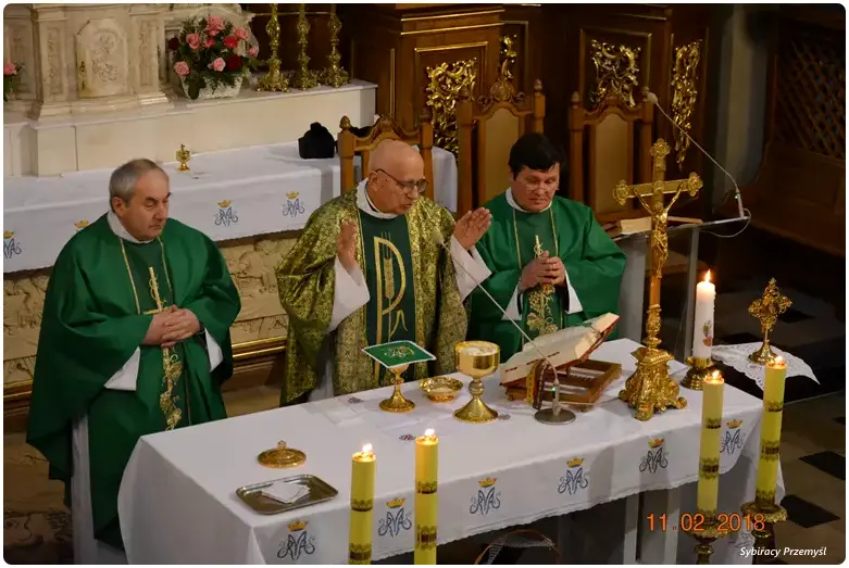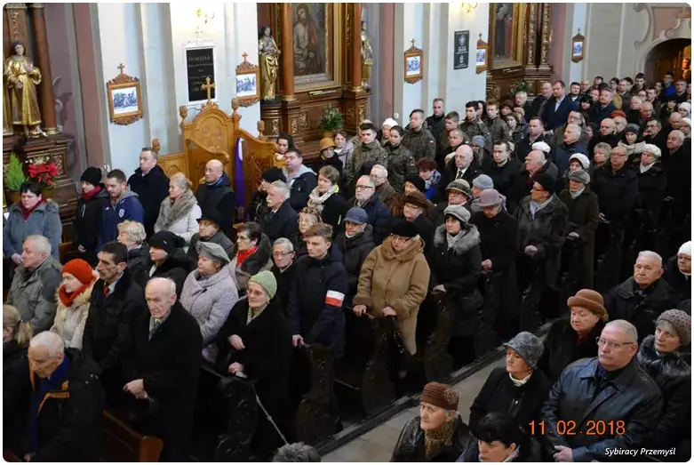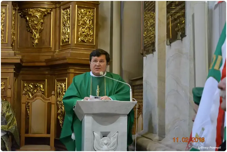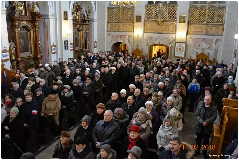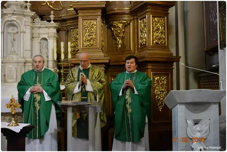 „Drodzy Bracia i Siostry. Dzisiejsza niedziela jest wyjątkowa zwłaszcza dla naszej przemyskiej parafii pw. św. Trójcy. Gromadzimy się z tej okoliczności, ze właśnie wczoraj minęła 78 rocznica pierwszej deportacji Polaków na Sybir. Dzisiaj świętujemy tę rocznicę dlatego tutaj się licznie gromadzimy. Mszy św. przewodniczy Ks. Prałat Stanisław Czenczek i jest o. Władysław, który pracował wiele lat we Lwowie i tutaj jako franciszkanin jest z nami. Wszystkich serdecznie pozdrawiam szczególnie Sybiraków i do naszej modlitwy zapraszam. Ta dzisiejsza rocznica upamiętnia pierwszą wywózkę ok. 140 tysięcy Polaków, którzy zostali deportowani na „nieludzką ziemię” a później były następne i dzisiaj trudno się doliczyć ale wiemy, że było to ponad milion tych, którzy tam stracili życie, kontakt z Ojczyzną. Niektórzy zostali, niektórzy wrócili, niektórzy teraz wracają i nasza Ojczyzna wreszcie wypracowuje pewne polityczne możliwości żeby niektórzy, którzy chcą mogli na starość, może na koniec życia wrócić do Polski. Dzisiaj przezywamy także międzynarodowy dzień chorego. Wspominamy datę 11 luty 1858 r. kiedy Matka Boża objawiła się we Francji i było to dokładnie 160 lat temu. To tam powiedziała: „Jestem Niepokalane Poczęcie”, tam pojawiły się liczne cuda i dlatego też Ojciec św. Jan Paweł II w 1992 r. ten dzień ogłosił jako Światowy Dzień Chorego.