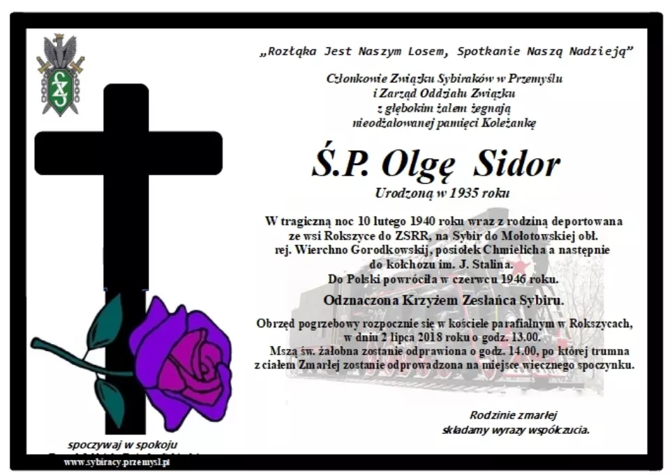 Odeszła od nas śp. Olga Sidor Członkowie i Zarząd Związku Sybiraków Oddział w Przemyślu z głębokim żalem żegnają koleżankę Olgę Sidor. Post Views: 365 1 lipca 20182 ODESZLI OD NAS Nawigacja wpisu Poprzedni Poprzedni wpis: 90. rocznica powstania Związku Sybiraków. Uroczystości w Warszawie 29.06.2018 r. (Film)Następny Następny wpis: Odeszła od nas śp. Stefania Zbiegień Podobne wpisy Odszedł od nas śp. Józef Lelek 23 września 2025 Wyrazy współczucia dla Kolegi Józefa Sieńko 27 sierpnia 2025 Odeszła od nas śp. Janina Boczar 24 czerwca 2025 Odszedł od nas śp. Eugeniusz Buszta 10 maja 2025 Odeszła od nas śp. Krystyna Sroczyk 27 marca 2025 Odeszła od nas śp. Janina Radyk 17 marca 2025