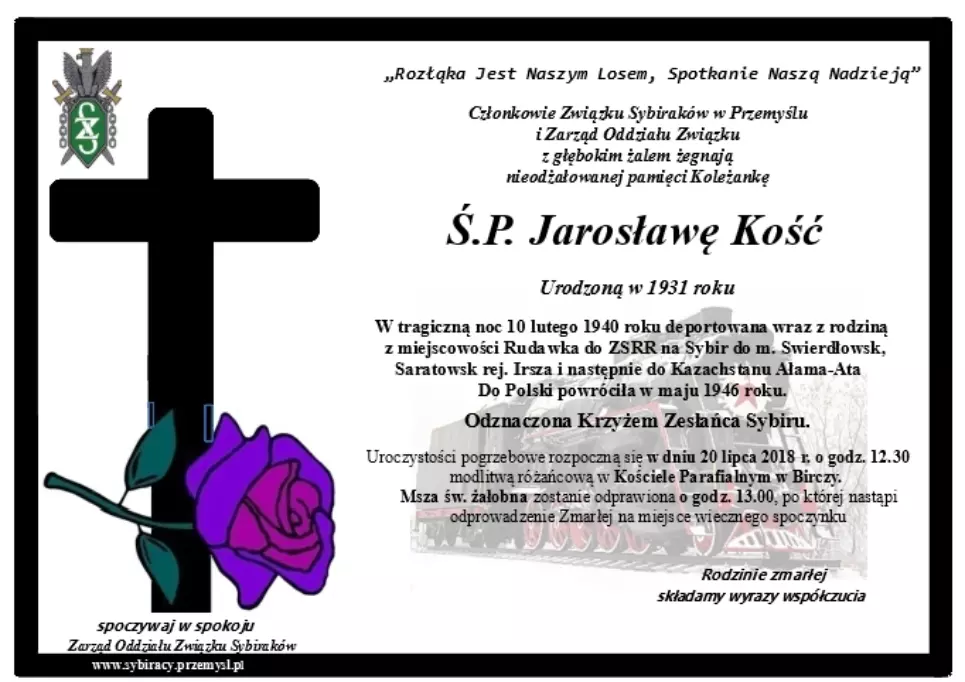 Odeszła od nas śp. Jarosława Kość Członkowie i Zarząd Związku Sybiraków Oddział w Przemyślu z głębokim żalem żegnają koleżankę śp. Jarosławę Kość Post Views: 293 18 lipca 20182 ODESZLI OD NAS Nawigacja wpisu Poprzedni Poprzedni wpis: 75. rocznicę rzezi wołyńskiej. 11.07.2018 r.Następny Następny wpis: Odszedł od nas śp. Andrzej Charchan Podobne wpisy Odszedł od nas śp. Józef Lelek 23 września 2025 Wyrazy współczucia dla Kolegi Józefa Sieńko 27 sierpnia 2025 Odeszła od nas śp. Janina Boczar 24 czerwca 2025 Odszedł od nas śp. Eugeniusz Buszta 10 maja 2025 Odeszła od nas śp. Krystyna Sroczyk 27 marca 2025 Odeszła od nas śp. Janina Radyk 17 marca 2025