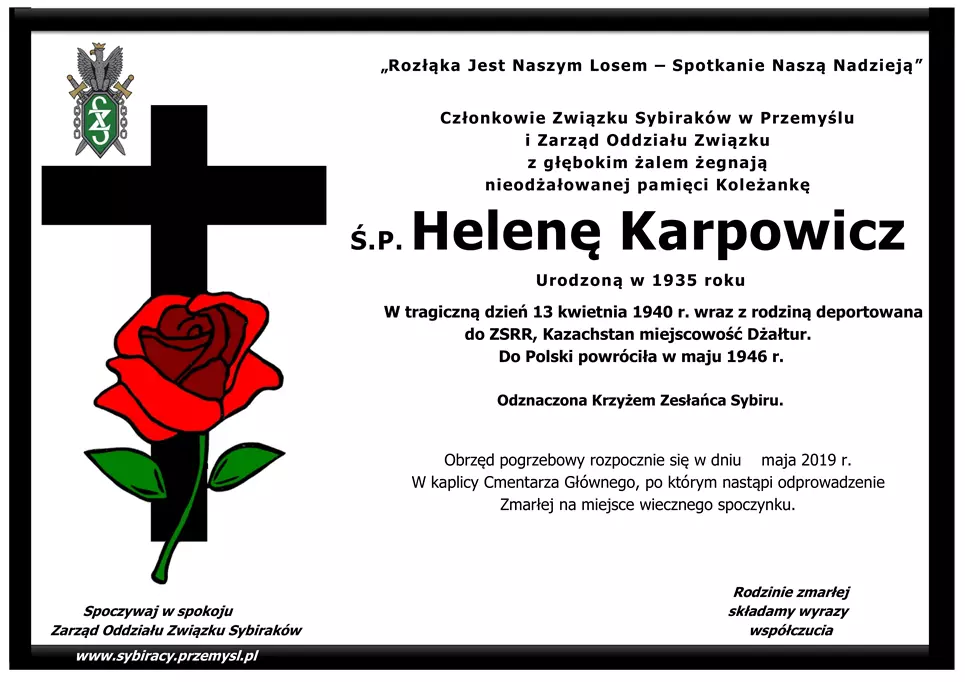 Odeszła od nas śp. Helena Karpowicz Członkowie i Zarząd Związku Sybiraków Oddział w Przemyślu z głębokim żalem żegnają koleżankę śp. Helenę Karpowicz Post Views: 282 13 maja 20192 ODESZLI OD NAS Nawigacja wpisu Poprzedni Poprzedni wpis: 228 rocznica uchwalenia Konstytucji 3 maja – uroczystości w Przemyślu.Następny Następny wpis: Związek Sybiraków Oddział w Przemyślu zakwalifikowany do Programu Dotacyjnego „Niepodległa” 2019. Podobne wpisy Odszedł od nas śp. Józef Lelek 23 września 2025 Wyrazy współczucia dla Kolegi Józefa Sieńko 27 sierpnia 2025 Odeszła od nas śp. Janina Boczar 24 czerwca 2025 Odszedł od nas śp. Eugeniusz Buszta 10 maja 2025 Odeszła od nas śp. Krystyna Sroczyk 27 marca 2025 Odeszła od nas śp. Janina Radyk 17 marca 2025