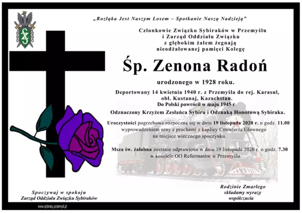 Odszedł od nas śp. Zenon Radoń Członkowie i Zarząd Związku Sybiraków w Przemyślu z głębokim żalem żegnają Kolegę Sybiraka śp. Zenona Radoń Kwatera 39 Rząd 3 Nr grobu 10 Data urodzenia 1928-10-22 Data zgonu 2020-11-12 Post Views: 305 17 listopada 20202 ODESZLI OD NAS Nawigacja wpisu Poprzedni Poprzedni wpis: „Laurki od serca” od przedszkolaków dla przemyskich Sybiraków.Następny Następny wpis: Kresy utracone czyli „Roztrzaskane lustro”, podróż sentymentalna Teresy Paryny Podobne wpisy Odszedł od nas śp. Józef Lelek 23 września 2025 Wyrazy współczucia dla Kolegi Józefa Sieńko 27 sierpnia 2025 Odeszła od nas śp. Janina Boczar 24 czerwca 2025 Odszedł od nas śp. Eugeniusz Buszta 10 maja 2025 Odeszła od nas śp. Krystyna Sroczyk 27 marca 2025 Odeszła od nas śp. Janina Radyk 17 marca 2025