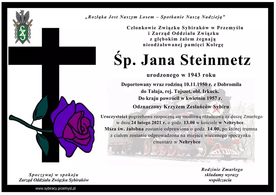 Odszedł od nas śp. Jan Steinmetz Członkowie i Zarząd Związku Sybiraków w Przemyślu z głębokim żalem żegnają kolegę Sybiraka śp. Jana Steinmetz Post Views: 291 23 lutego 20212 ODESZLI OD NAS Nawigacja wpisu Poprzedni Poprzedni wpis: Izba Pamięci Stubieńskich Zesłańców SybiruNastępny Następny wpis: Odszedł od nas śp. Tadeusz Lelek Podobne wpisy Odszedł od nas śp. Józef Lelek 23 września 2025 Wyrazy współczucia dla Kolegi Józefa Sieńko 27 sierpnia 2025 Odeszła od nas śp. Janina Boczar 24 czerwca 2025 Odszedł od nas śp. Eugeniusz Buszta 10 maja 2025 Odeszła od nas śp. Krystyna Sroczyk 27 marca 2025 Odeszła od nas śp. Janina Radyk 17 marca 2025