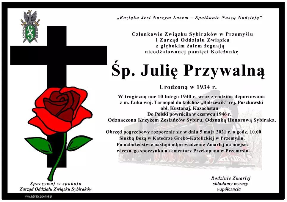 Odeszła od nas śp. Julia Przywalna Członkowie Związku Sybiraków w Przemyślu i Zarząd Oddziału Związku z głębokim żalem żegnają nieodżałowanej pamięci Koleżankę Post Views: 300 3 maja 20212 ODESZLI OD NAS Nawigacja wpisu Poprzedni Poprzedni wpis: 230. rocznica uchwalenia Konstytucji 3go Maja.Następny Następny wpis: Koncert w 81. rocznicę deportacji kwietniowej. Podobne wpisy Odszedł od nas śp. Józef Lelek 23 września 2025 Wyrazy współczucia dla Kolegi Józefa Sieńko 27 sierpnia 2025 Odeszła od nas śp. Janina Boczar 24 czerwca 2025 Odszedł od nas śp. Eugeniusz Buszta 10 maja 2025 Odeszła od nas śp. Krystyna Sroczyk 27 marca 2025 Odeszła od nas śp. Janina Radyk 17 marca 2025