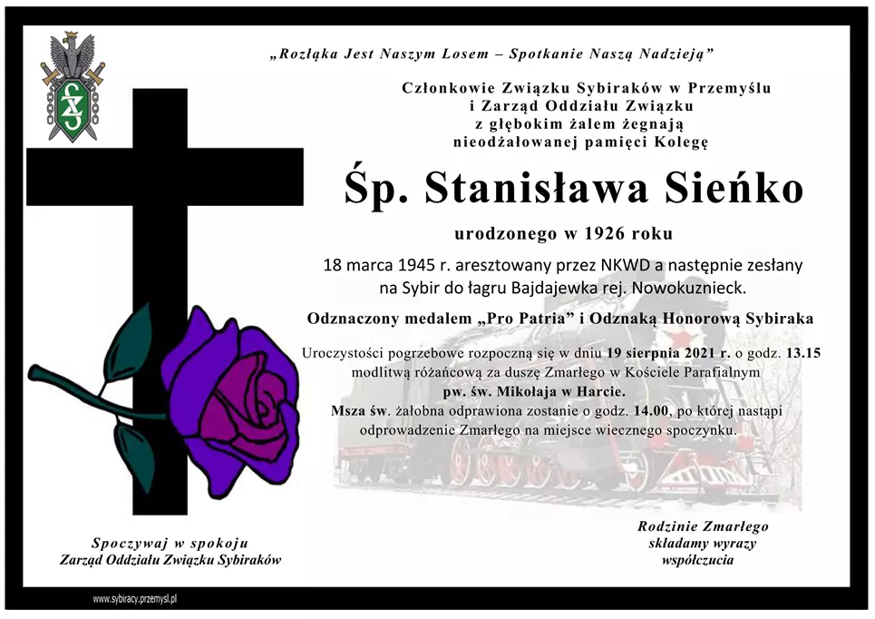 Odszedł od nas śp. Stanisław Sieńko Członkowie i Zarząd Związku Sybiraków w Przemyślu z głębokim żalem żegnają Kolegę śp. Stanisława Sieńko Na ręce Kolegi Józefa Sieńko składamy wyrazy współczucia dla całej rodziny. Post Views: 326 18 sierpnia 20212 ODESZLI OD NAS Nawigacja wpisu Poprzedni Poprzedni wpis: Odeszła od nas śp. Władysława GruntowiczNastępny Następny wpis: Otwarcie wystawy pamięci kard. Stefana Wyszyńskiego Podobne wpisy Odszedł od nas śp. Józef Lelek 23 września 2025 Wyrazy współczucia dla Kolegi Józefa Sieńko 27 sierpnia 2025 Odeszła od nas śp. Janina Boczar 24 czerwca 2025 Odszedł od nas śp. Eugeniusz Buszta 10 maja 2025 Odeszła od nas śp. Krystyna Sroczyk 27 marca 2025 Odeszła od nas śp. Janina Radyk 17 marca 2025