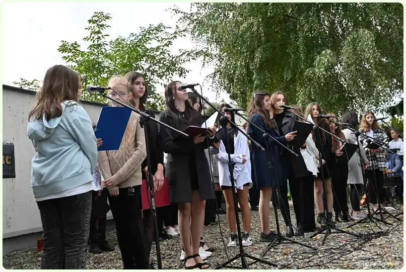 Uczniowie przygotowani przez Panią Monikę Góruk, Pana Marcina Dumę i Pana Łukasza Cebeńko w montażu słowno-muzycznym przypomnieli ważne wydarzenia z okresu II wojny światowej. Na zakończenie uroczystości przed ścianą straceń złożono kwiaty i zapalono znicze.