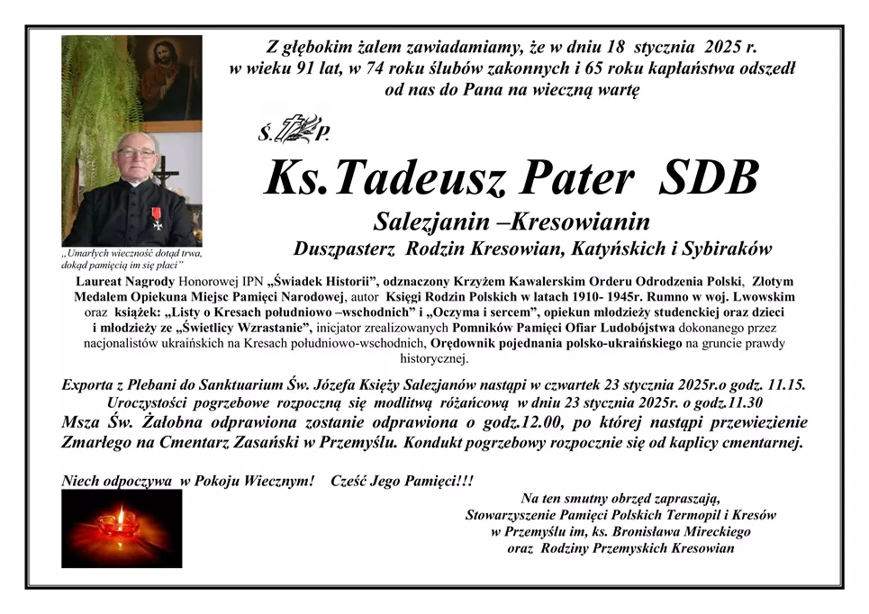 Ks. Tadeusz urodził się w Rumnie w województwie lwowskim w 1933 r., gdzie spędził dzieciństwo. Jako jedenastoletnie dziecko był świadkiem ogromnej tragedii, kiedy w nocy z 2 na 3 czerwca 1944 r. ukraińscy nacjonaliści z OUN-UPA zamordowali kilkudziesięciu mieszkających tam Polaków. Poczucie obowiązku wobec tych ofiar mobilizowało go do podejmowania wielu znaczących inicjatyw, mających na celu ocalenie od zapomnienia tej strasznej tragedii.