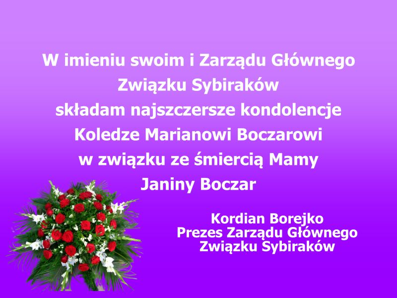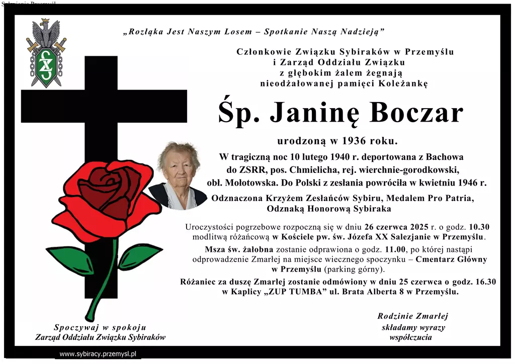Odeszła od nas śp. Janina Boczar Członkowie Związku Sybiraków w Przemyślu i Zarząd Oddziału Związku z głębokim żalem żegnają nieodżałowanej pamięci Koleżankę, współzałożycielkę Koła Związku Sybiraków w Przemyślu Post Views: 199 24 czerwca 20252 ODESZLI OD NAS Nawigacja wpisu Poprzedni Poprzedni wpis: W Boże Ciało ulicami Przemyśla przeszła procesja eucharystyczna.Następny Następny wpis: 82. rocznica Zbrodni Wołyńskiej Podobne wpisy Odszedł od nas śp. Józef Lelek 23 września 2025 Wyrazy współczucia dla Kolegi Józefa Sieńko 27 sierpnia 2025 Odszedł od nas śp. Eugeniusz Buszta 10 maja 2025 Odeszła od nas śp. Krystyna Sroczyk 27 marca 2025 Odeszła od nas śp. Janina Radyk 17 marca 2025 Odeszła od nas śp. Kazimiera Drewniowska 12 marca 2025