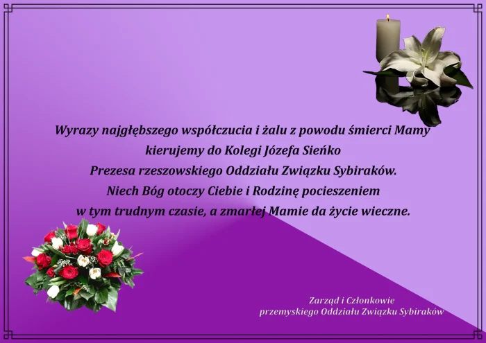 Członkowie Związku Sybiraków w Przemyślu i Zarząd Oddziału Związku z głębokim żalem żegnają nieodżałowanej pamięci Koleżankę, współzałożycielkę Koła Związku Sybiraków w Przemyślu