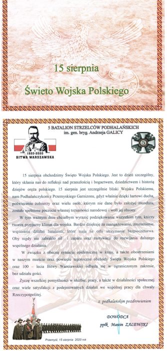 Słowo Dowódcy 5 BATALIONU STRZELCÓW PODHALAŃSKICH im. gen. bryg Andrzeja Galicy przesłane do Sybiraków