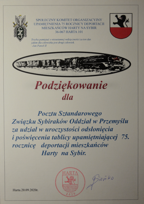 Społeczny Komitet Organizacyjny upamiętnienia 75. rocznicy deportacji Polaków na Sybir przesłał do przemyskiego Oddziału Związku Sybiraków podziękowania za pomoc w zorganizowaniu uroczystości w miejscowości Harta.