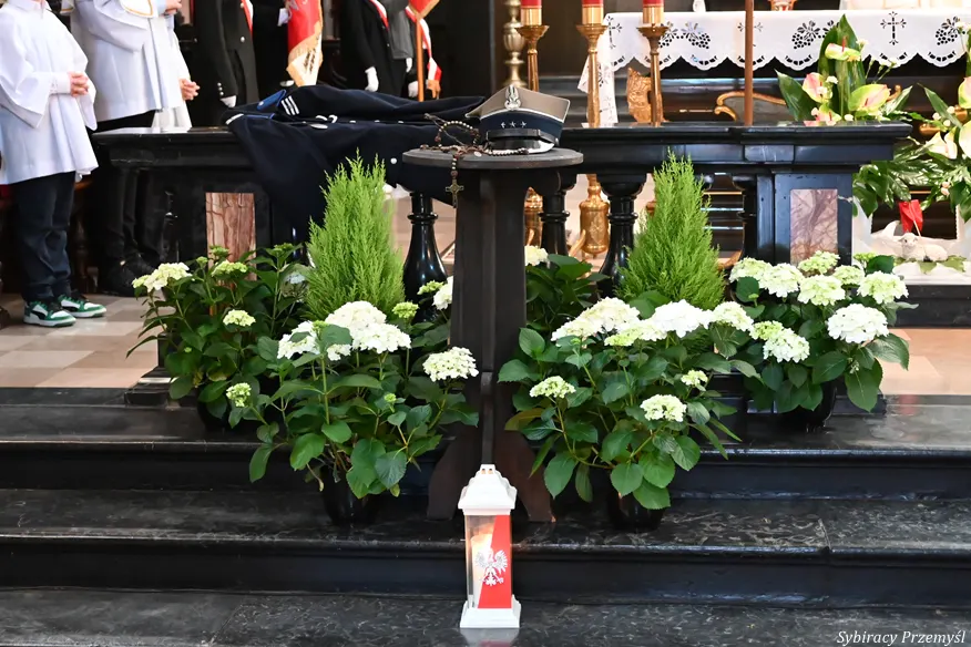 Przed zakończeniem Mszy św. pod ścianą z tabliczkami Ofiar Zbrodni Katyńskiej (Przemyślan) i tablicą pamięci Inwalidów zostały złożone wiązanki kwiatów.
